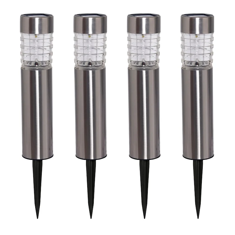 Our 4-pack decorative outdoor Gannon silver metal solar pathway light set shines softly for mood lighting in your garden, on the patio or balcony. Each modern 3-Lumen outdoor lantern light comes with a stake, which can insert into patio pots, the garden and around the lawn. Lamps are made of silver metal and plastic and are very durable, ready to stand up to the elements. Decorative lanterns can be placed just about anywhere, decorating your environment when you’re entertaining, camping, fishing, and so much more.