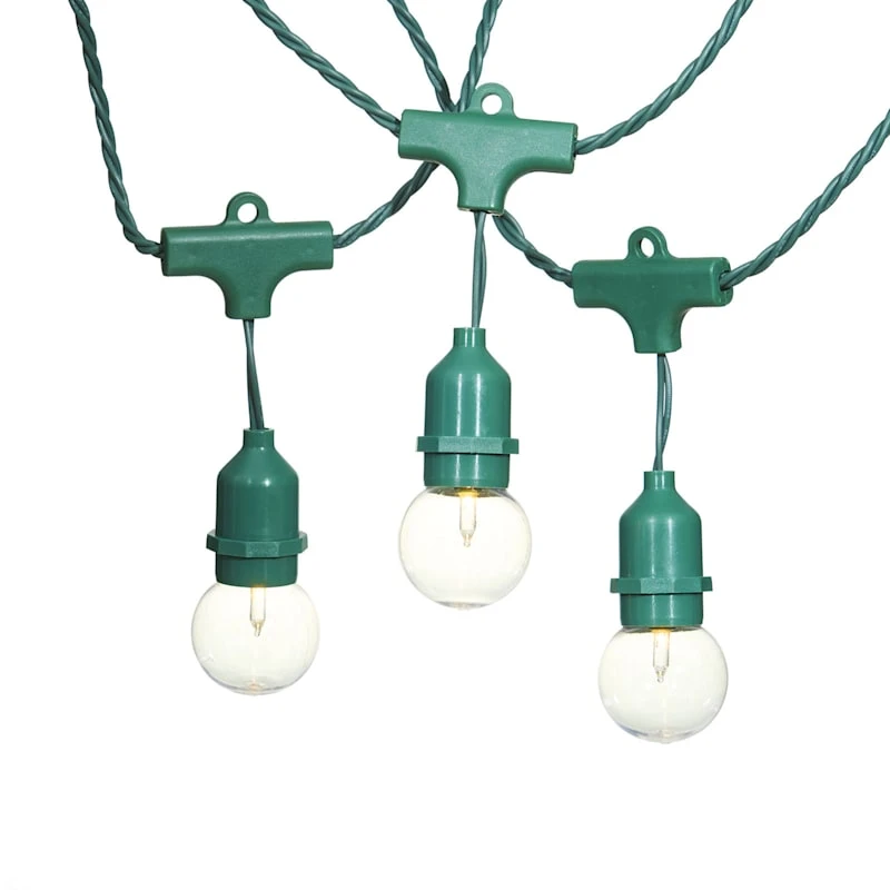 Set the perfect mood year-round with our 30-count clear UL G40 commercial style globe string light set! The warm glow adds fun and excitement to any indoor space. With a 40-foot green wire, these lights are easily hung around a room and the safety fuse plug and durable coordinating wire will keep it shining for seasons to come.