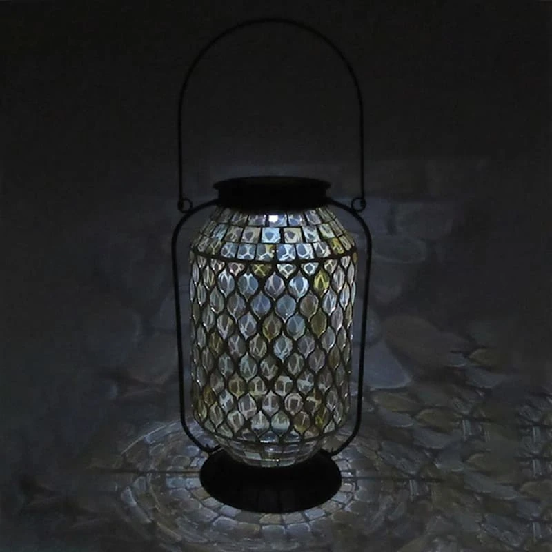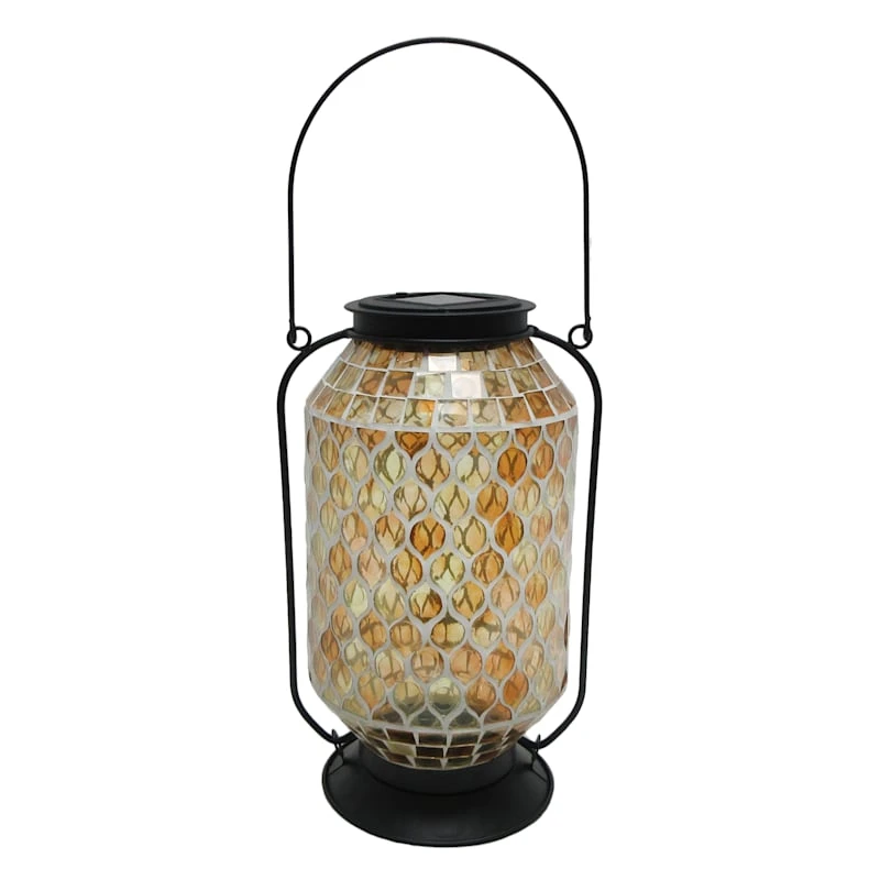 This 11in. amber mosaic glass solar lantern is the perfect addition to any home decor, inside or out. The candle lamp lights from within and adds to the overall ambience. The flexible handle makes it easy to hang from any hook, or it can also be set on the hearth, bookshelf or on the patio table, too.