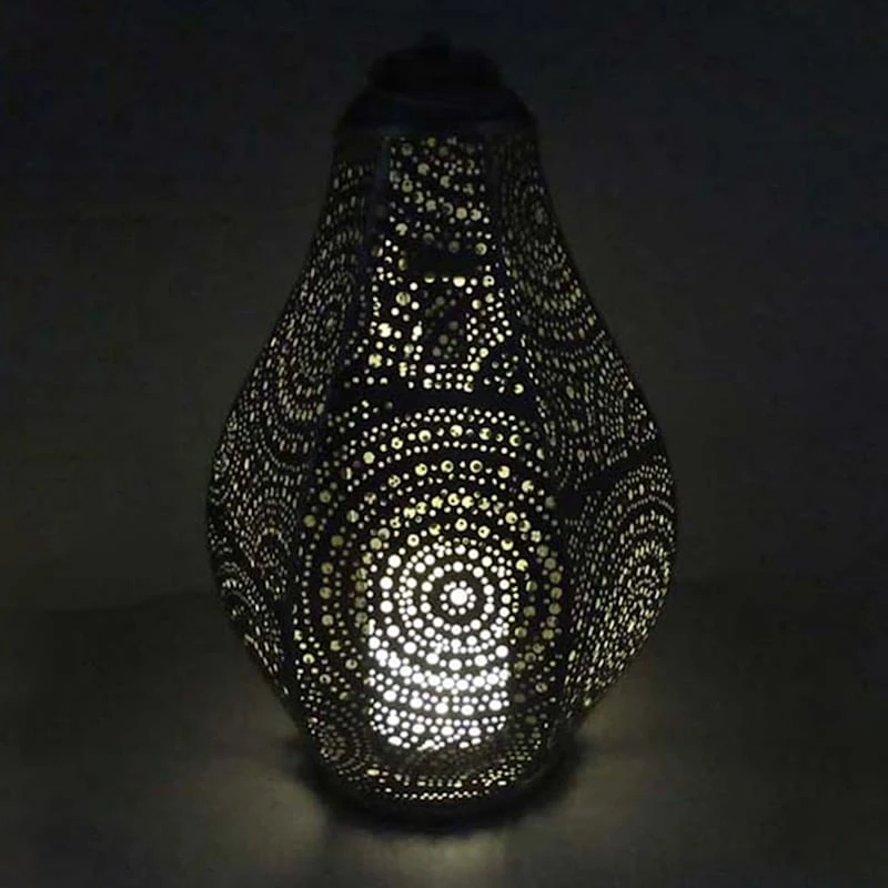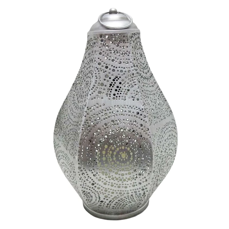 This 15in. antique silver Moroccan-style punched metal solar lantern is the perfect addition to any home decor, inside or out. The candle lamp lights from within and adds to the overall ambience. The flexible hoop makes it easy to hang from any hook, or it can also be set on the hearth, bookshelf or on the patio table, too.