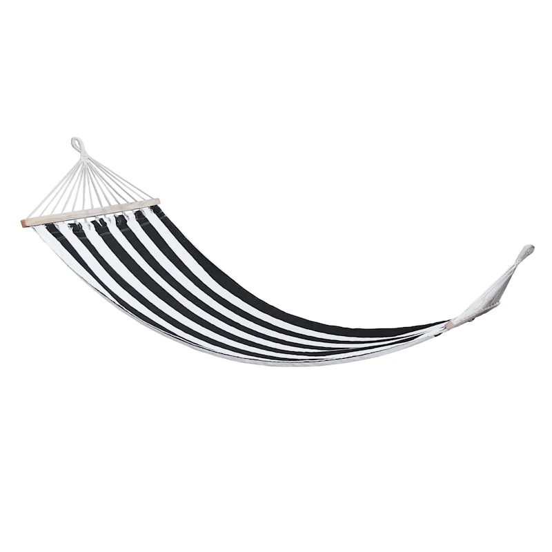 Our black and white striped outdoor hammock is made of polyester in a bright summer shade perfect for your outdoor space. Spreader posts are included to keep the hammock open and ready for use. Create a relaxing oasis in your backyard where you can just hang and chill.