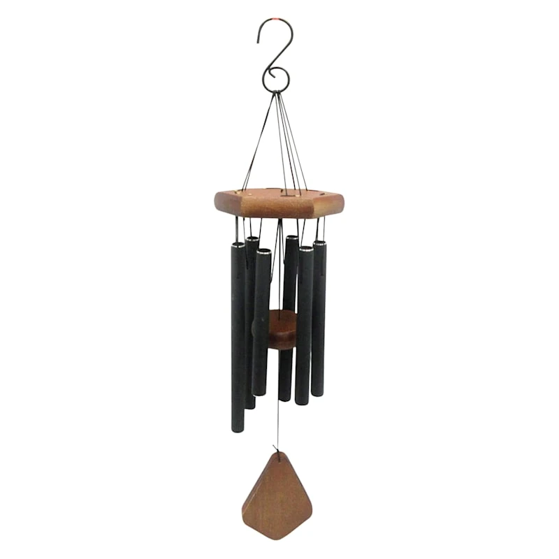 Featuring a black tubular silhouette, our 17.5in. tiered metal and wood wind chimes create a clear and graceful sound. Wind chimes are symbolic of serenity and tranquility and are also thought to bring luck to whomever listens to them. The perfect gift for the outdoor lover.