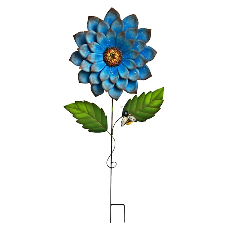 Add a joyful symbol of summer to your yard with our blue petal flower garden stake. Strong and durable, this beauty is crafted of painted metal and features leaf and bee detail and beautiful weathered hues of blue, black, yellow and green. Use this stake as an accessory in your garden, potted plants or front yard as a bright welcome.