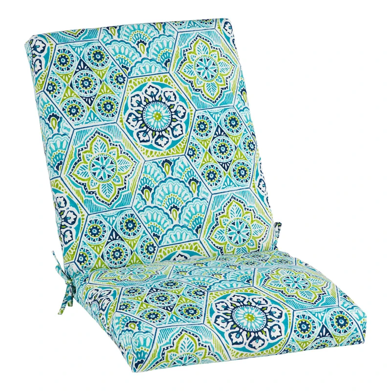 Make moments enjoying the great outdoors even more pleasing with our Calista hinged outdoor patio cushion, perfect for boosting the comfort and style of your favorite outdoor spaces. The thick cushion features ties at the seat and a teal tile print to give it a little personality and look its best amongst the elements.