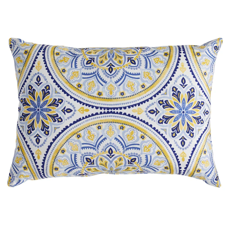 Our outdoor pillows are durable and ready to stand up to the elements. Polyester construction and all-weather capability make this 14x20in Castille multicolor lumbar outdoor throw pillow is a must-have for outdoor entertaining. With the fashion-forward color, you can create a stunning patio, porch or deck that will be the talk of the neighborhood. Check our overall selection for a variety of shapes, sizes, patterns and colors to fit the personality of your patio.