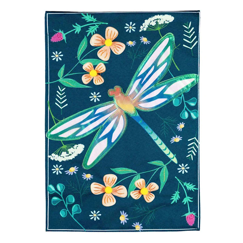 Welcome visitors to your home with our flower and dragonfly garden flag. Featuring a colorful dragonfly motif on a dark blue backdrop, this banner is the perfect spring or summer yard decoration.