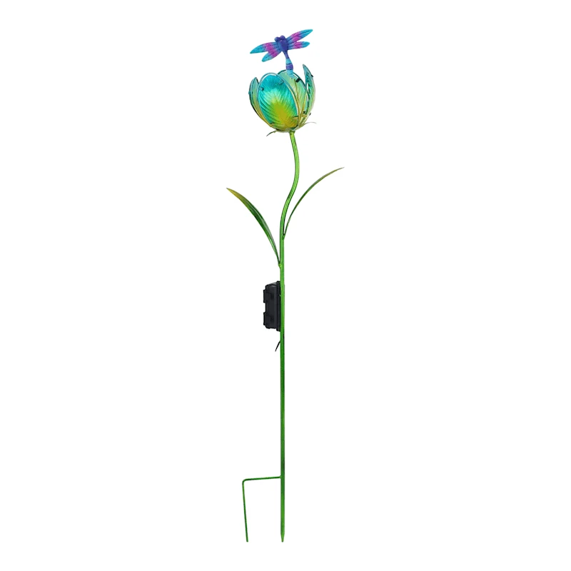 Add a pinch of fun to your garden with our colorful metal 36.5in. flower and dragonfly lighted orb outdoor garden stake. Created with love, this detailed metal piece features a double spike base with a detailed dragonfly and floral petal design. Everyone will enjoy the charming subject matter tucked into your prolific garden. Made of rust-resistant metal, this garden stake is designed to bring an illuminated touch to your landscaping.