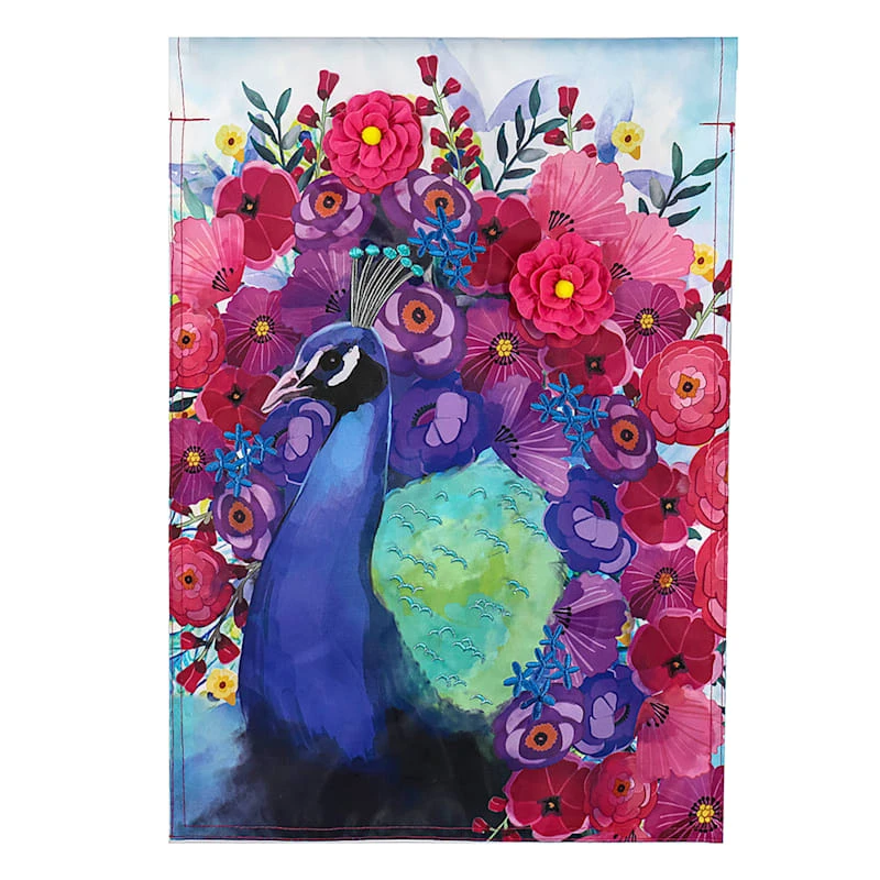Welcome visitors to your home with our whimsical floral peacock garden flag. Featuring a blue, purple, pink, red, yellow and white motif, this banner is the perfect spring or summer yard decoration.