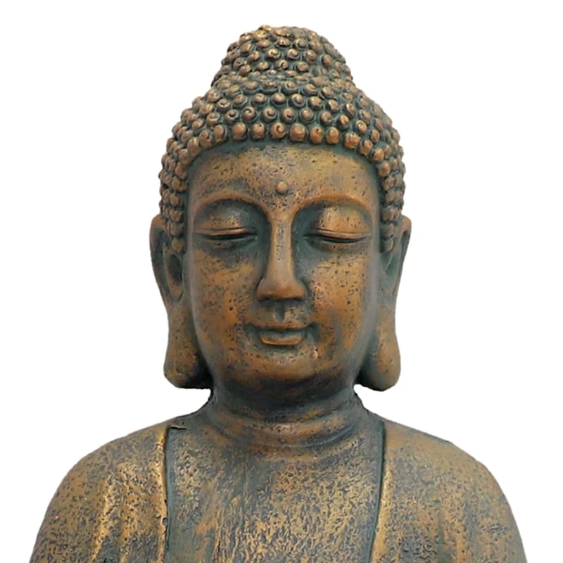 Found & Fable is a new collection that lets you explore what’s right around the corner. Choose your own adventure every day. Savor it all and say yes to what comes next�exclusively At Home. Made of durable resin, this weathered golden 17in. Buddha statuary is perfect indoors and out. The sculpture features a peaceful sitting Buddha motif. The charming sight of this wonderful figurine accent will be a conversation starter in any room.