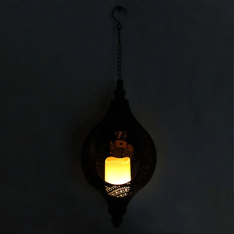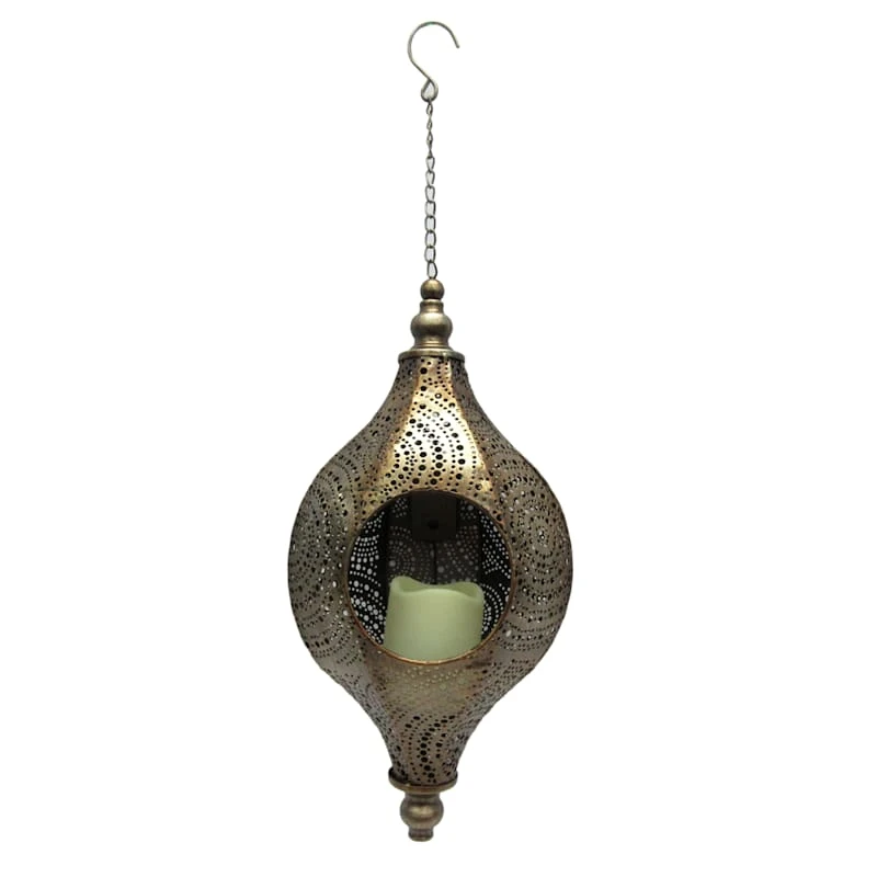 Found & Fable is a new collection that lets you explore what’s right around the corner. Choose your own adventure every day. Savor it all and say yes to what comes next—exclusively At Home. Add a charming touch to any outdoor space with our solar punched metal Moroccan style hanging lantern. An LED candle within automatically illuminates at dusk, creating a magical glow. The beautiful antique brass patina is complemented by a classic metal drop design with a simple metal hook on chain. This outdoor lantern will make a stunning display in your garden or on your patio.