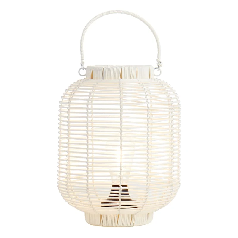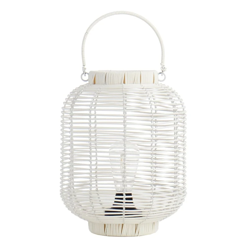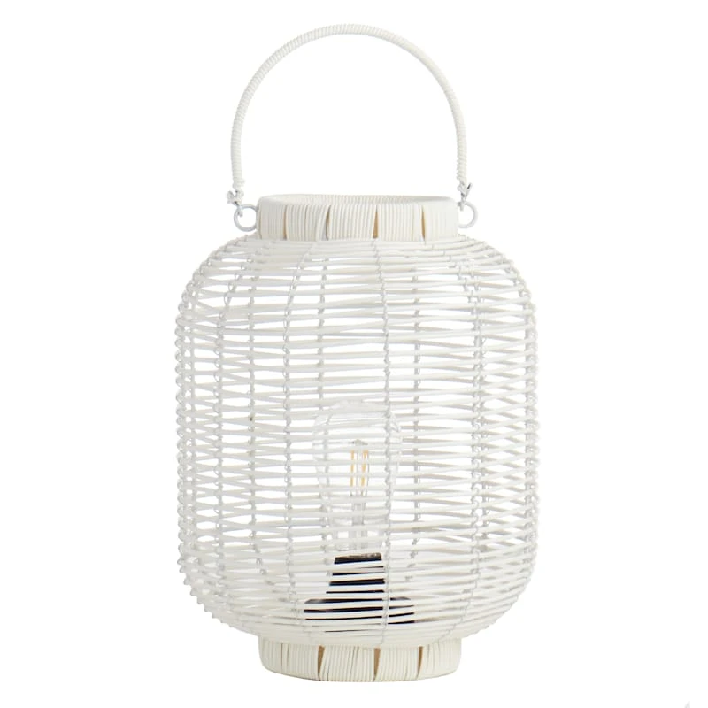 Add a charming touch to any outdoor space with our decorative 12.6in. white plastic wicker barrel lantern. An LED bulb within will illuminate at night, creating a magical glow. The wonderful silhouette is highlighted with a global, natural look. This outdoor lantern will make a stunning display in your garden or on your patio.