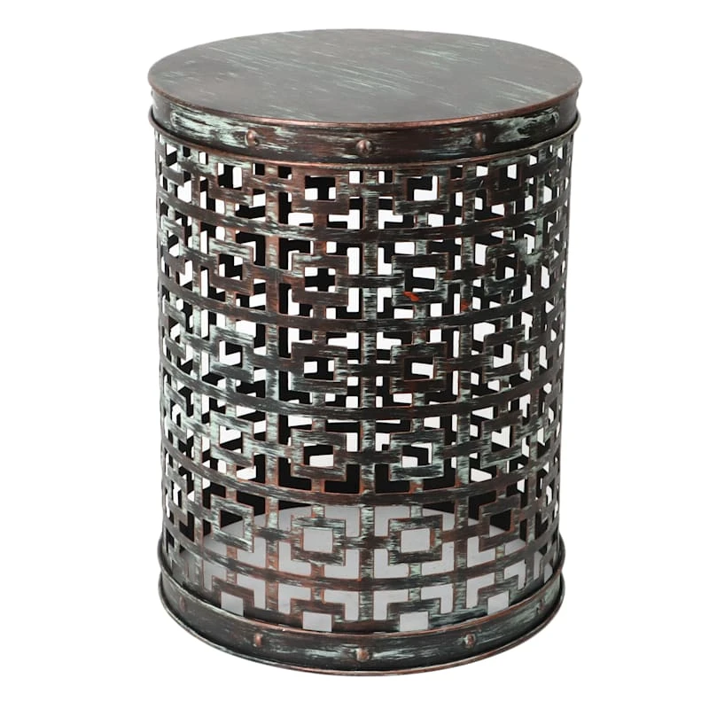 Found & Fable is a new collection that lets you explore what’s right around the corner. Choose your own adventure every day. Savor it all and say yes to what comes next—exclusively At Home. This handy medium sized punched metal plant stand works as a display piece or as a spare seat to in your garden room or patio, or it’s the perfect place to set your drink and nibbles while visiting. Made from weathered look metal with a barrel silhouette and faux tarnish finish. An allover cutout design gives it loads of personality. The stool is designed with a linked box cutout motif that’s sure draw attention.