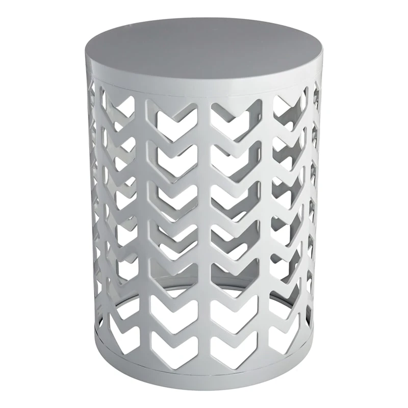 Give your plants a fun spot to hang out with our 18in. round grey metal chevron plant stand. Featuring a cool cylindrical design, this piece will be right at home inside or out. Whether setting up a garden room, or simply looking to save a plant from the chilly outdoors, this stand is a great option for ornamenting your home.