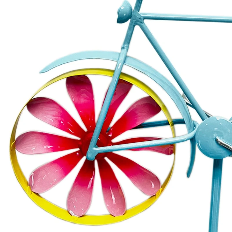 Add a pinch of fun animation to your garden with our blue, pink and yellow metal bicycle whirligig garden stake. Created with love, this detailed metal piece features a rear basket. Everyone will enjoy the colorful spinning bicycle spokes as they whirl away in the wind. Made of rust-resistant metal, this garden stake is designed to look like a classic bike wheeling through your garden.