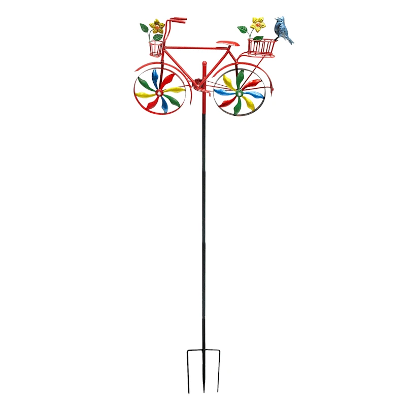 Add a pinch of fun animation to your garden with our metal bicycle garden stake. Created with love, this detailed metal piece features a front and back basket with happy riders hanging on for the breezy ride. Everyone will enjoy the colorful spinning bicycle spokes as they whirl away in the wind. Made of rust-resistant metal, this garden stake is designed to look like a classic bike wheeling through your garden.