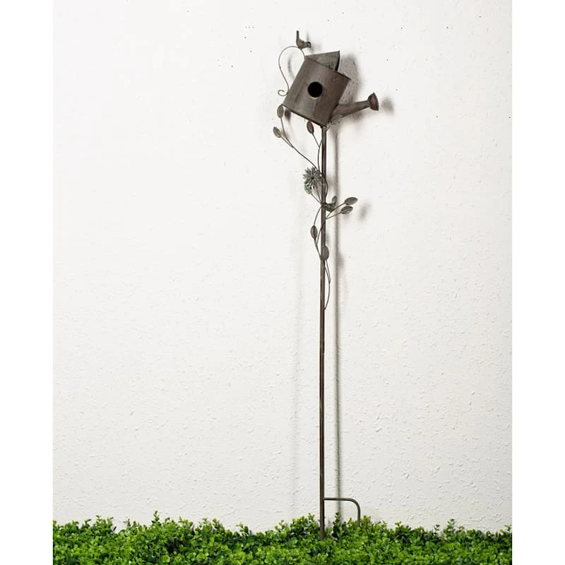 Add a touch of whimsy to your yard with our watering can birdhouse garden stake. Created with love, this detailed natural metal decor features a spike pole with a leafy vine, bird and watering can motif. Everyone will enjoy the charming birdhouse tucked into your prolific garden. Made of rust-resistant metal.