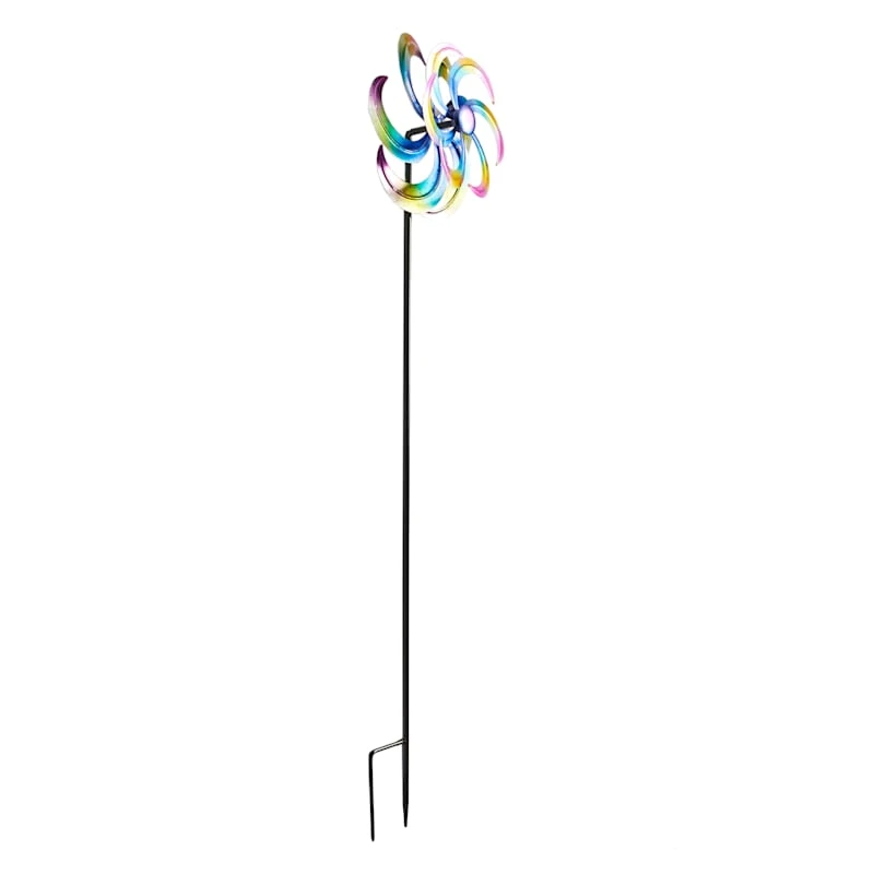 Our metal wind spinner is the perfect garden decoration for whimsy lovers. This kinetic garden stake features a colorful peacock-look windmill top that rotates in the breeze. With brightly colored metal details, this whirligig adds a touch of personality and motion to any outdoor space.