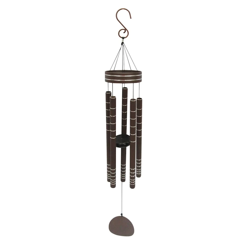 Etched silver and brown tubes adorn our tiered metal wind chime, which creates a clear and graceful sound. Wind chimes are symbolic of serenity and tranquility and are also thought to bring luck to whomever listens to them. The perfect gift for the outdoor lover.