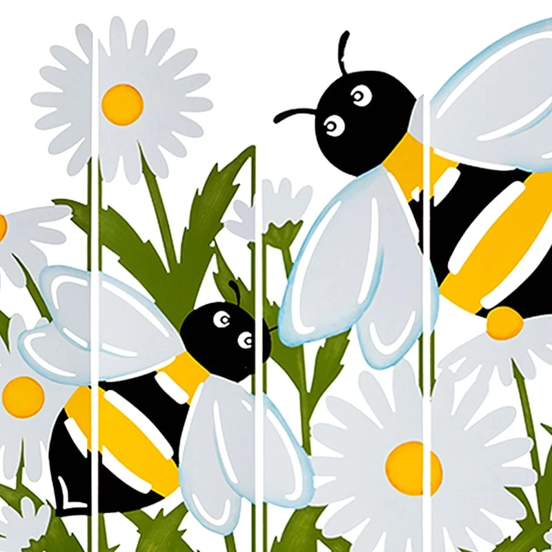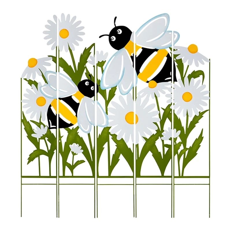 Add a pinch of fun to your garden with our colorful metal 41.5in. multi-panel bumble bee outdoor garden stake. Created with love, this detailed metal piece features pointed spikes with a detailed bee and daisy flower design. Everyone will enjoy the charming subject matter tucked into your prolific garden. Made of painted green, white, yellow and black rust-resistant metal, this garden stake is designed to bring a natural touch to your landscaping.