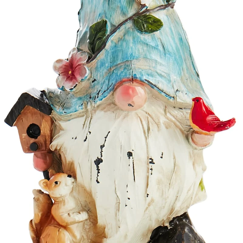 Our resin blue hat gnome is the perfect garden decoration for whimsy lovers. This fun figurine features a colorful painted finish, and the gnome holds a birdhouse and is accompanied by a friendly squirrel ready to bring some shenanigans to the garden. With the brightly colored sculpted resin details, this statue adds a touch of personality and excitement to any outdoor space.