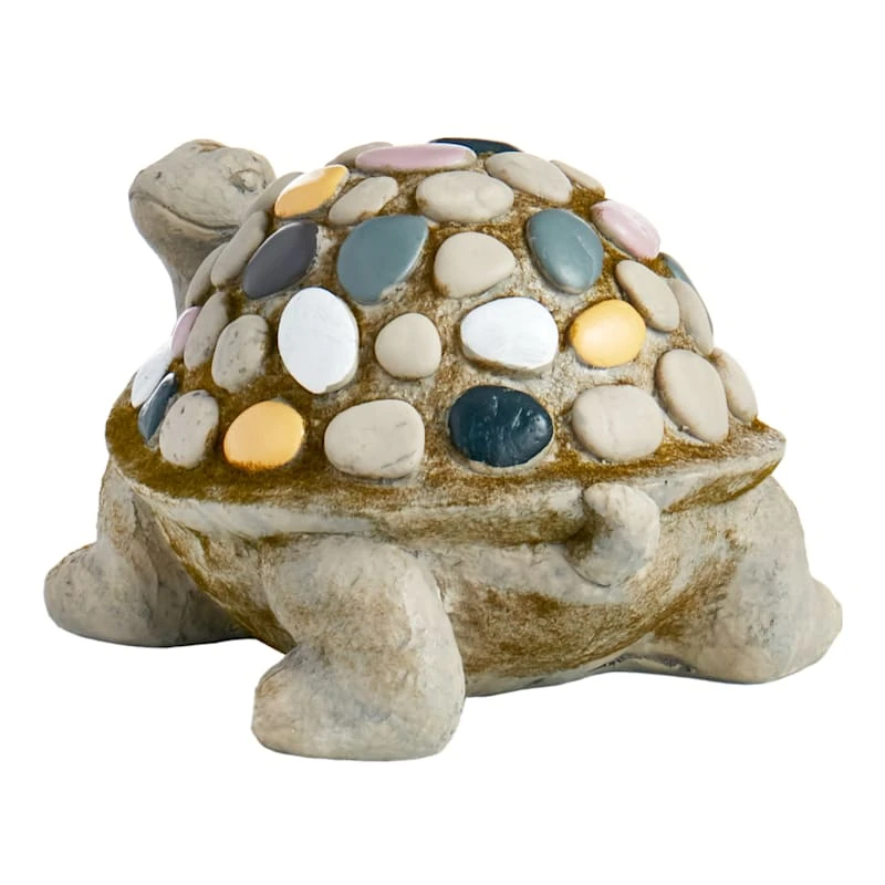 Enjoy your outdoor living areas a little bit more with our handmade resin garden turtle decor. Made of durable resin, this figurine is perfect for outdoors. The garden sculpture features a wonderful multicolor pebble/rock motif on his shell. The peaceful sight of this garden visitor is sure to help tie your serene garden theme together.
