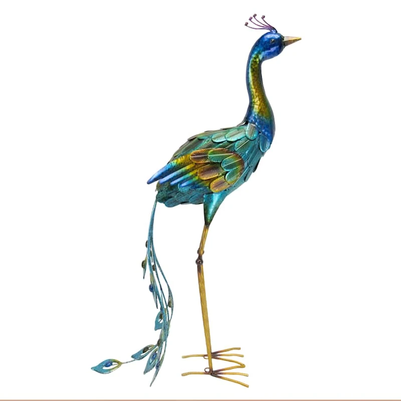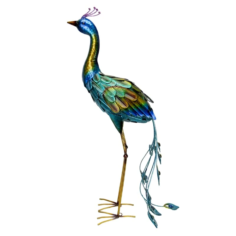 Round out your indoor or outdoor decor�s visual appeal with our peacock statue, crafted of green and blue metal and showcasing a regal peacock motif with its head up and tail down. This piece�s architectural details add a pop of pattern to your look, while the design�s colorful patina blends effortlessly into any color palette. Set this piece inside or out and it�ll round out your space with wonderful coordinating decor.
