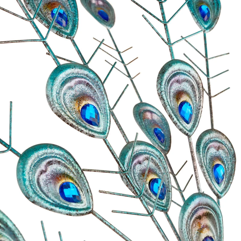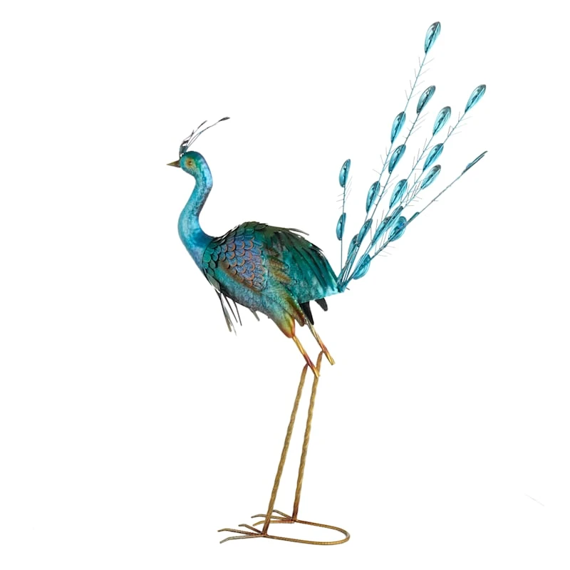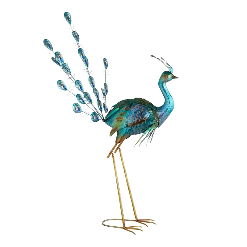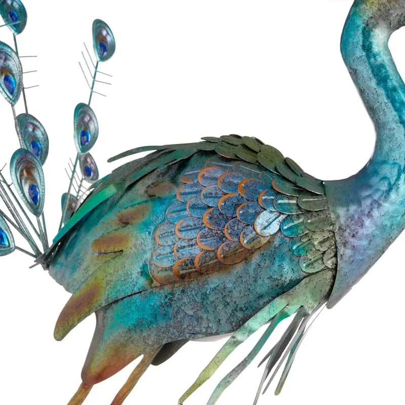 Round out your indoor or outdoor decor�s visual appeal with our peacock statue, crafted of green and blue metal and showcasing a regal peacock with its head and jeweled tail up. This piece�s architectural details add a pop of pattern to your look, while the design�s colorful patina blends effortlessly into any color palette. Set this piece inside or out and it�ll round out your space with wonderful coordinating decor.