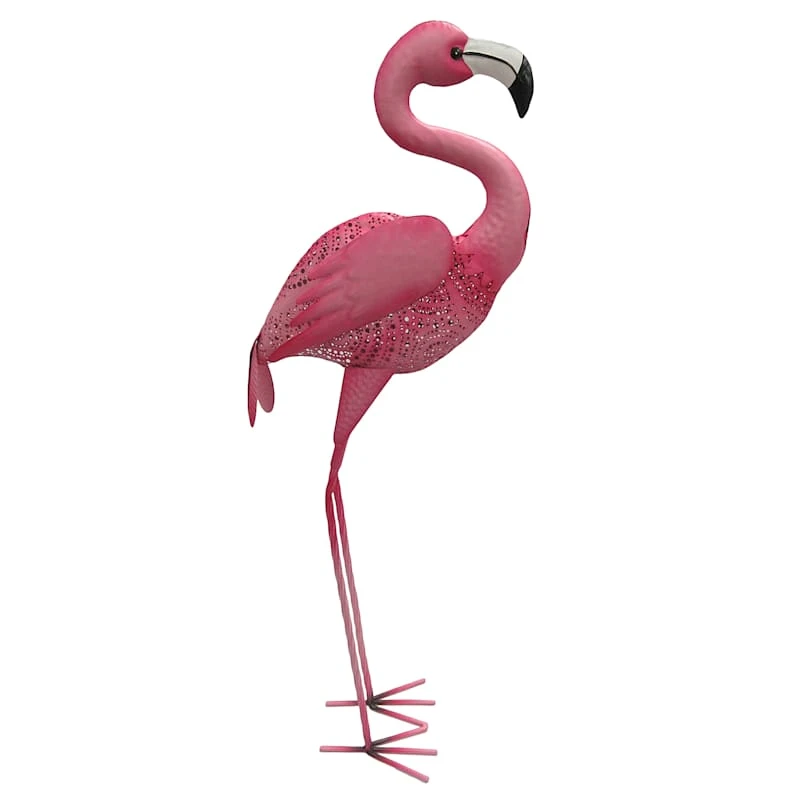Our metal standing flamingo is the perfect garden decoration for whimsy lovers. This clever garden statue features a regal bright pink flamingo standing in place quietly showing off his amazing beauty. With the brightly colored metal details, this garden figurine adds a touch of personality to any outdoor space.