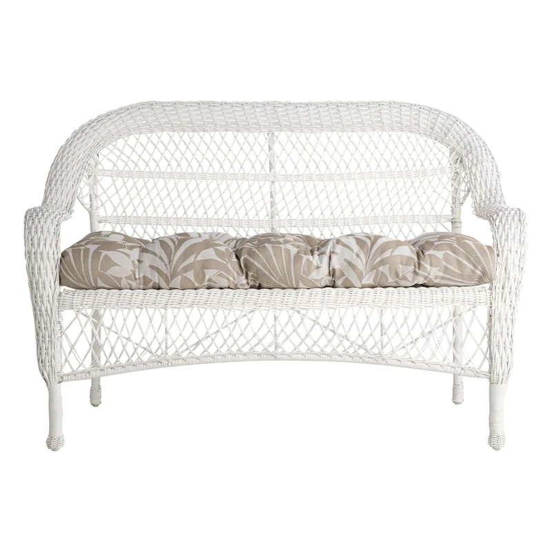 Our outdoor cushions are durable and ready to stand up to the elements. Polyester construction and all-weather capability make this Natural Royal Palm Outdoor Wicker Settee Cushion a must-have for outdoor entertaining. Create a stunning patio, porch or deck that will be the talk of the neighborhood. Check our overall selection for a variety of shapes, sizes, patterns and colors to fit the personality of your patio.