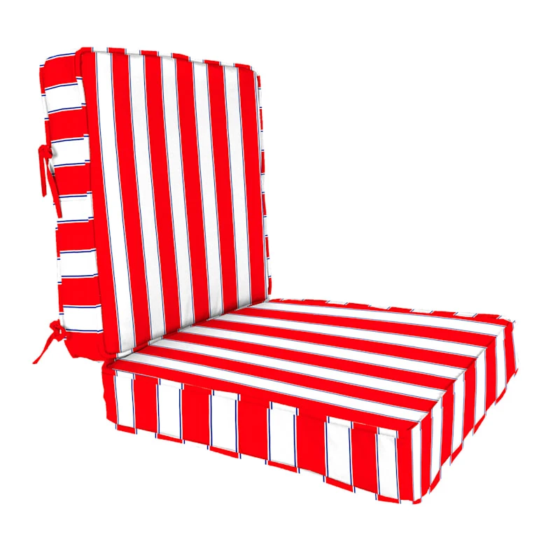 Make moments enjoying the great outdoors even more pleasing with our 2-Piece Providence Red, White & Blue Awning Striped Outdoor Gusseted Cushion Set, perfect for boosting the comfort and style of your favorite outdoor spaces. Create a stunning patio, porch or deck that will be the talk of the neighborhood. Check our overall selection for a variety of shapes, sizes, patterns and colors to fit the personality of your patio.