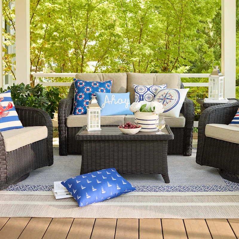 Give your family and friends a reason to look forward to a relaxing visit with our Glendale wicker loveseat. Its fresh neutral cushions are a wonderful contrast to the dark brown synthetic wicker finish. Simple and traditional, it will make a statement in a sunroom or on any outdoor patio or deck.