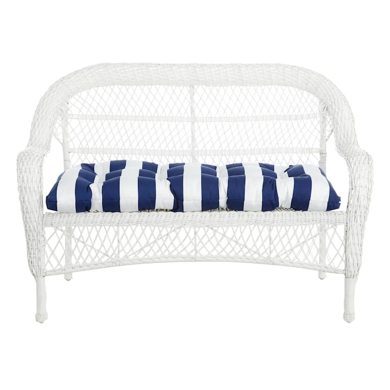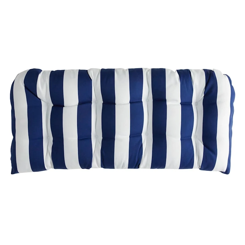 A collection that lets everyone relax in style. Polished finishes and classic hues pair with fun finds. Providence is where elegant settings still feel comfortable and warm—exclusively At Home. Our outdoor cushions are durable and ready to stand up to the elements. Polyester construction and all-weather capability make this navy blue awning stripe wicker settee cushion is a must-have for outdoor entertaining. With the fashion-forward navy blue and white design, you can create a stunning patio, porch or deck that will be the talk of the neighborhood. Check our overall selection for a variety of shapes, sizes, patterns and colors to fit the personality of your patio.