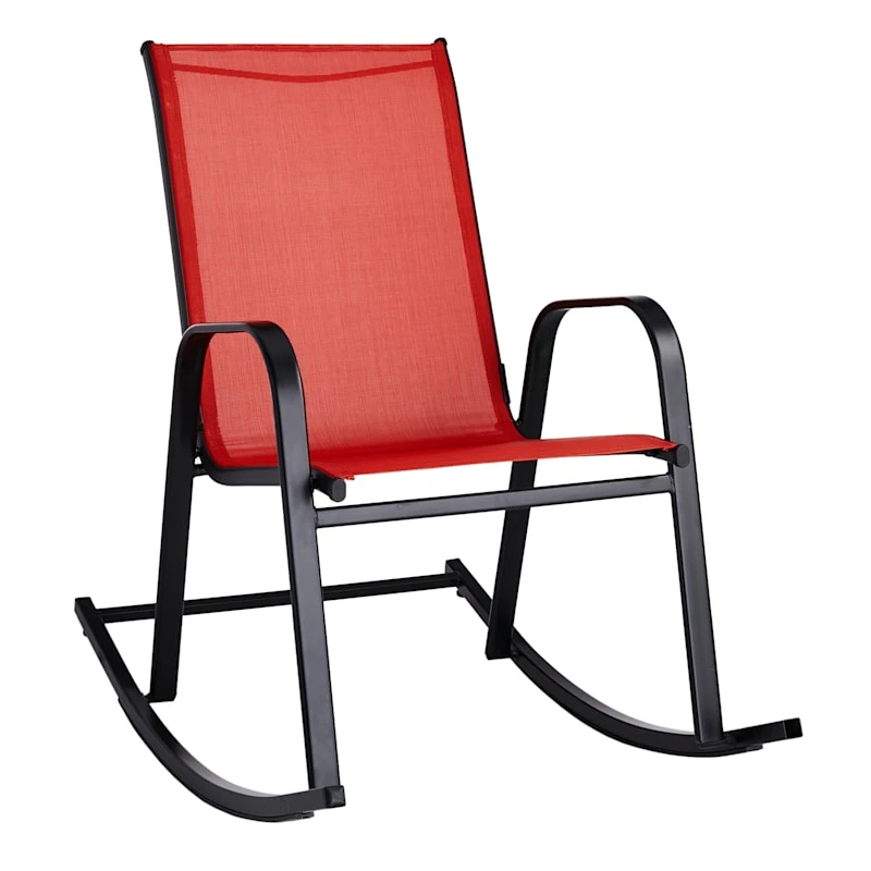 Escape the indoors and get outside with our black sling rocking chair for the patio. Buy in multiples and be sure to have enough outdoor seating for family and friends. This outdoor metal rocking chair features a simple, streamlined look with a metal frame and a comfortable red mesh fabric that’s breathable. This rocking chair will last even longer if protected from the elements. Pair with any patio table or garden stool and enjoy the great outdoors to the fullest.