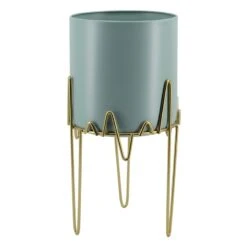 Highlight your green thumb and showcase your annuals and perennials at your front door or add a touch of festive foliage to your deck with our stylish 8in. sand green planter and a fanciful golden hairpin stand. More than just a spot to display your gardening skills, this modern pot has a contemporary appearance with its wonderful stand design. Created to live indoors or out, it’s ready to make your plants pop.