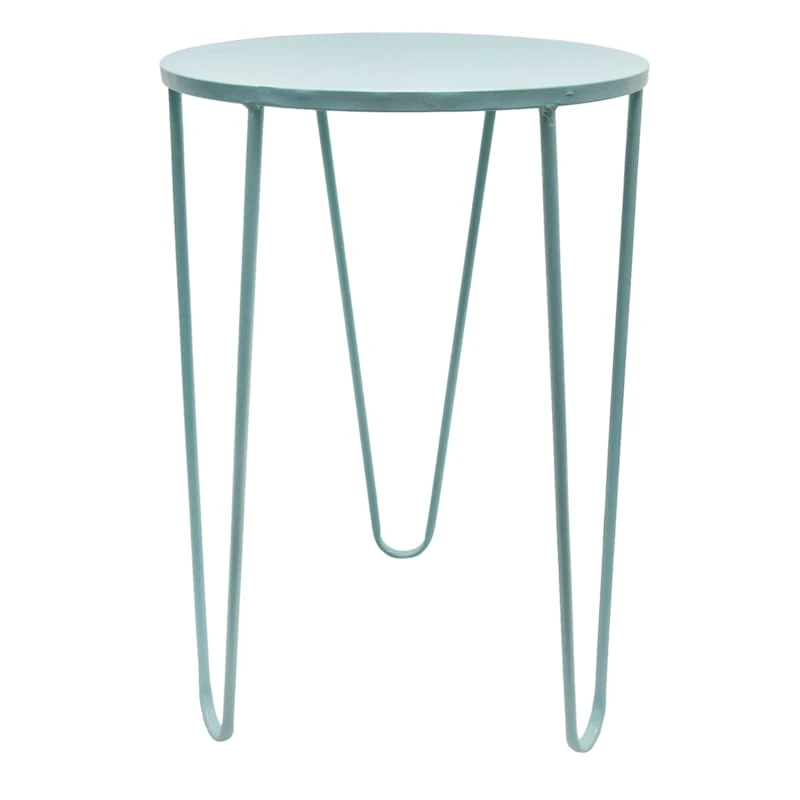 Our 22in. light blue metal top plant stand/accent table offers all kinds of options in your home decor—charmingly display your plants and use as a cool plant stand. This versatile little table can also be used to display decor or collectibles. This end table/plant stand with modern hairpin legs was engineered for long-term durability with a powder coated painted finish.