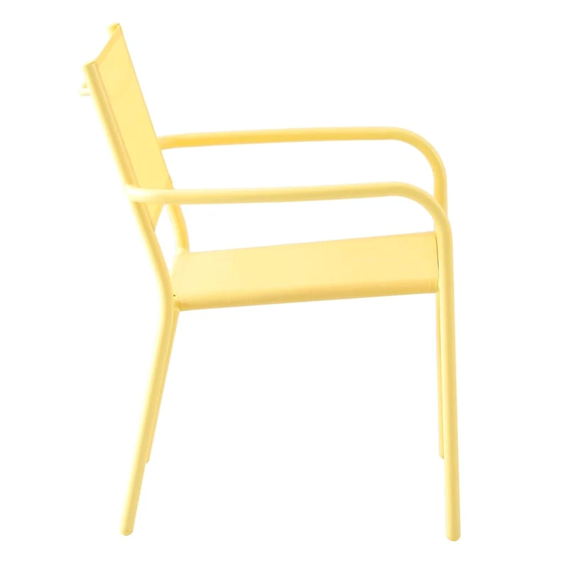 Enjoy the season and get outside with our stackable Sunny Club light yellow Textilene outdoor stackable chair. Buy in multiples and be sure to have enough outdoor seating for family and friends. This outdoor seat features a simple, streamlined look with a metal frame and a comfortable mesh fabric that’s breathable. This light yellow stacking chair will last even longer if protected from the elements. Pair with any patio table or garden stool and enjoy the great outdoors to the fullest.