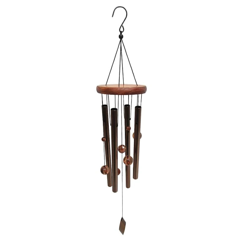 Featuring a bronzed tubular silhouette, our 25in. tiered metal, wood and glass bead wind chimes create a clear and graceful sound. Wind chimes are symbolic of serenity and tranquility and are also thought to bring luck to whomever listens to them. The perfect gift for the outdoor lover.